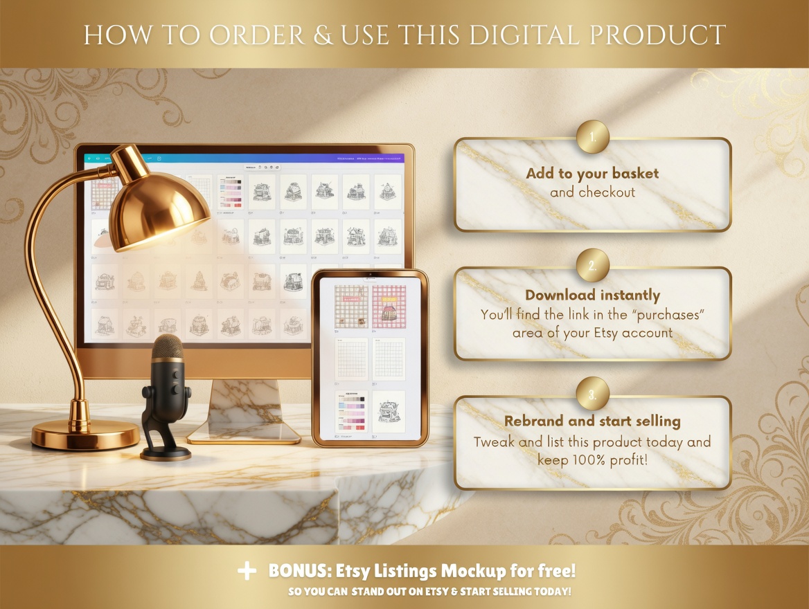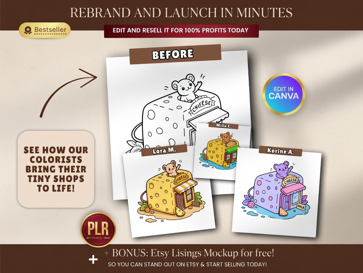 Featuring adorable illustrations of tiny shops, cozy storefronts, and charming retail scenes, this PLR package is perfect for creating best-selling printable and digital coloring books that appeal to both kids and adults.